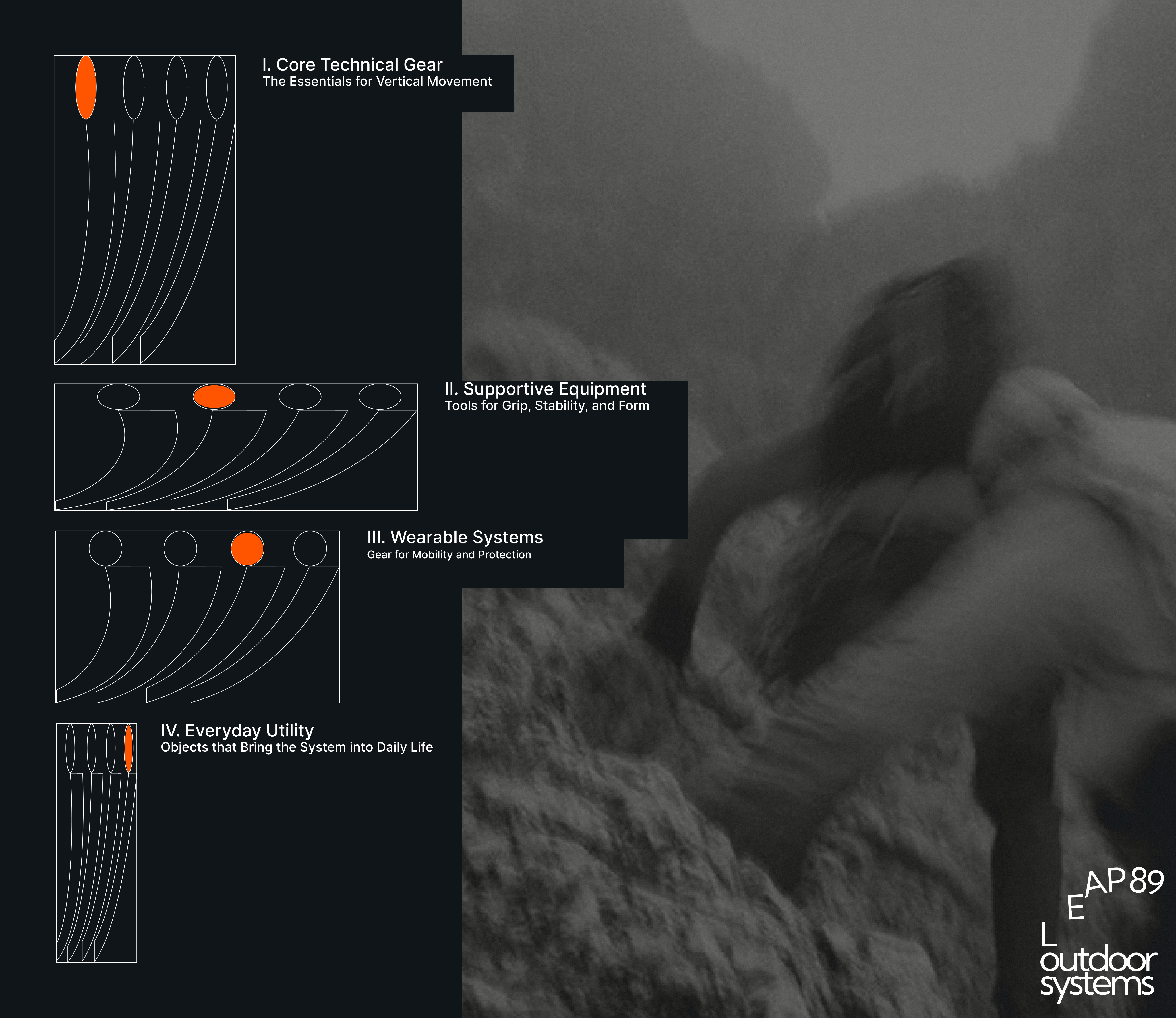 The system is structured into four tiers:Core (climbing essentials), Structural (load-bearing tools), Human (apparel), and Cultural (visual communication). Together, they form a modular identity that moves between functionality and narrative.