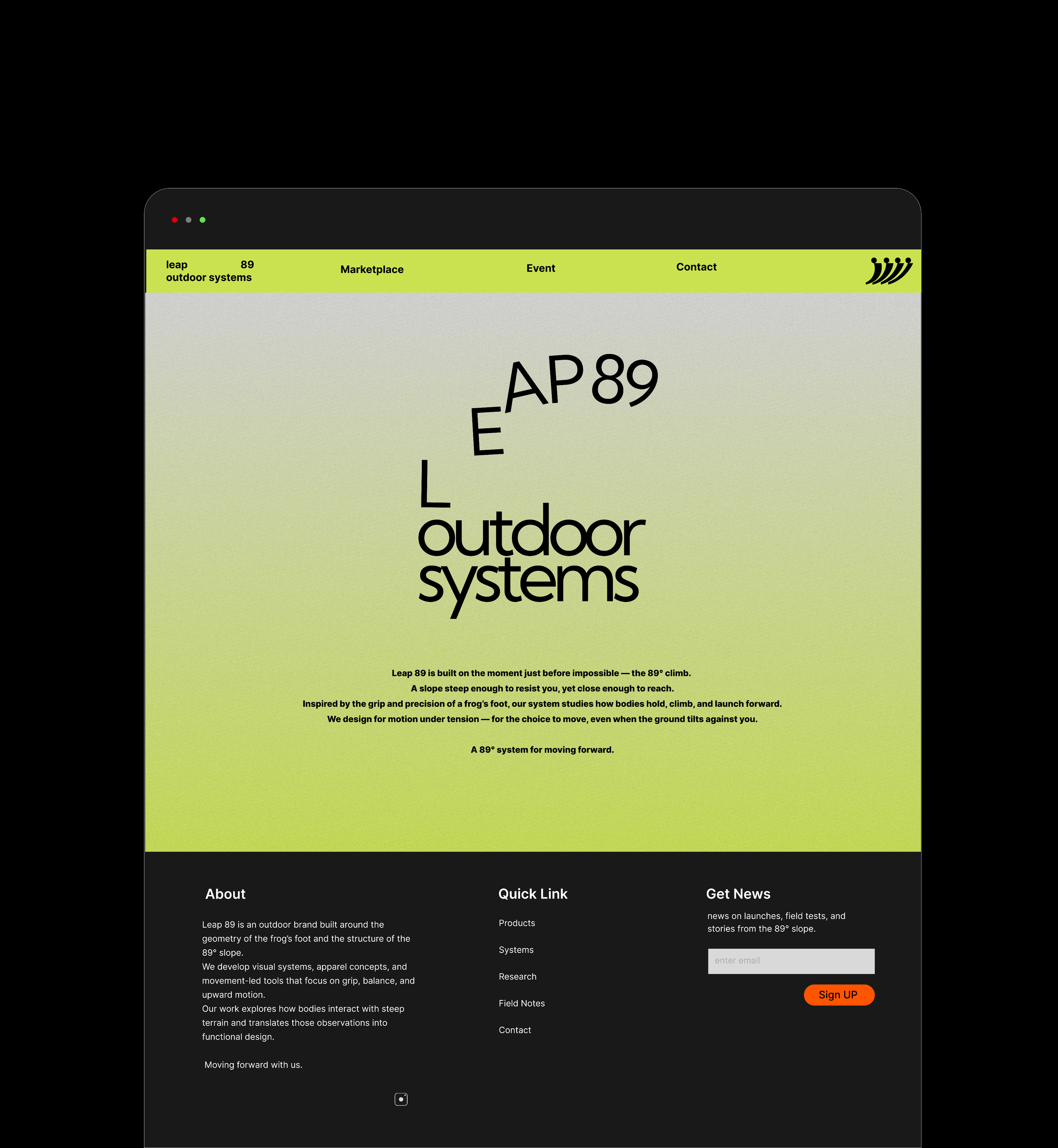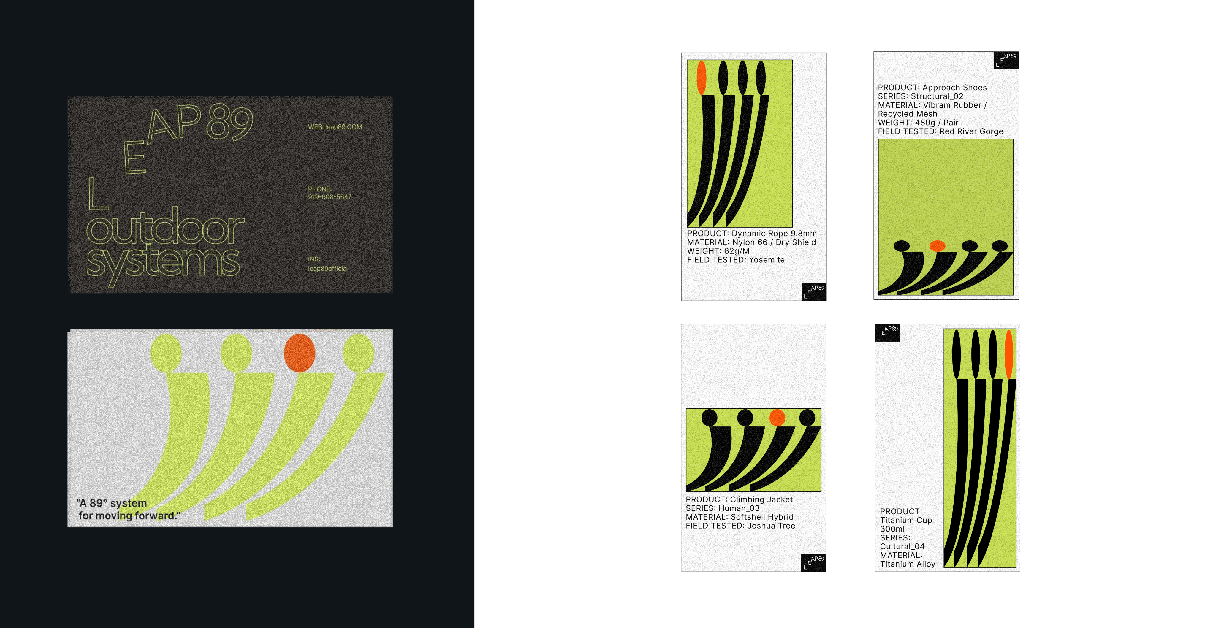 LEAP89 is an outdoor climbing brand built around the idea of the 89° slope—a near-vertical angle that is difficult but still possible. We chose 89° because anything less than 90° is still a slope — and any slope can be climbed.